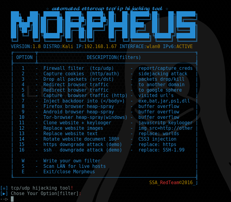 morpheus ships with a collection of etter filters writen be me to acomplish various tasks: replacing images in webpages, replace text in webpages, inject payloads using html <form> tag, denial-of-service attacks (drop,kill packets from source), https/ssh downgrade attacks, redirect target browser traffic to another domain and gives you the ability to build compile your filter from scratch and lunch it through morpheus framework (option W).